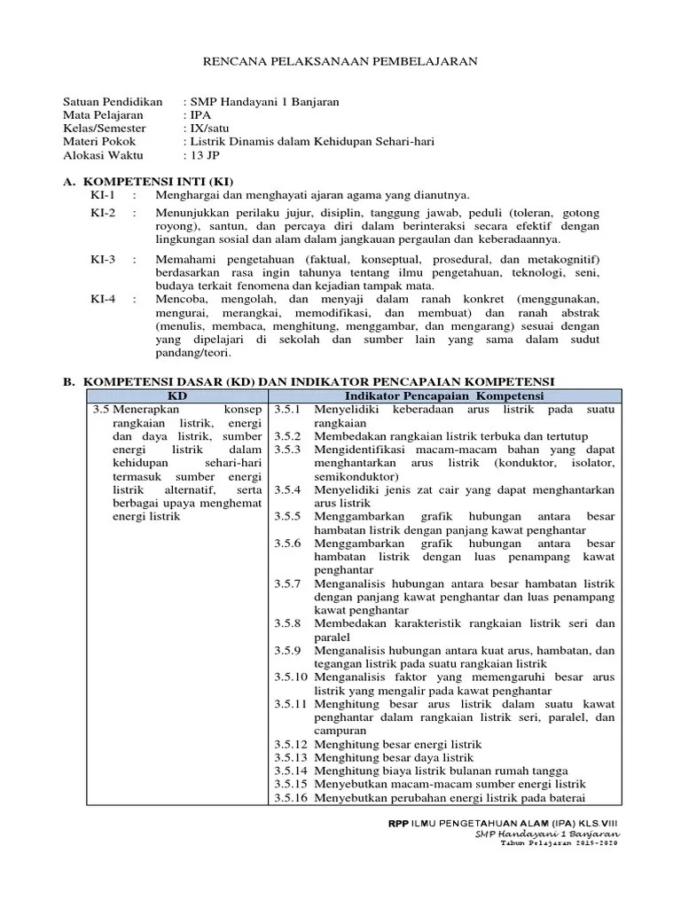 Rpp rangkaian listrik mata pelajaran materi pokok sub materi pokok satuan pendidikan kelas / semester.
