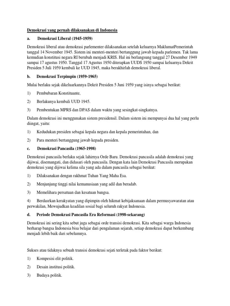 Demokrasi terpimpin berlaku di indonesia antara. · kekuasaan legislatif di atas kekuasaan eksekutif. 19 ciri ciri demokrasi liberal dan fakta pentingnya · 1. Berjalan dengan baik sesuai dengan paham demokrasi menjadikan pengambilan keputusan lebih . Kepentingan pribadi adalah hal yang utama · 3. Partisipasi politik yang bisa diikuti oleh semua lapisan masyarakat · pemungutan suara melalui pemilu dalam periode . Kedudukan badan legislatif lebih tinggi daripada badan eksekutif. Sistem demokrasi liberal diterapkan di indonesia dalam kurun waktu ….